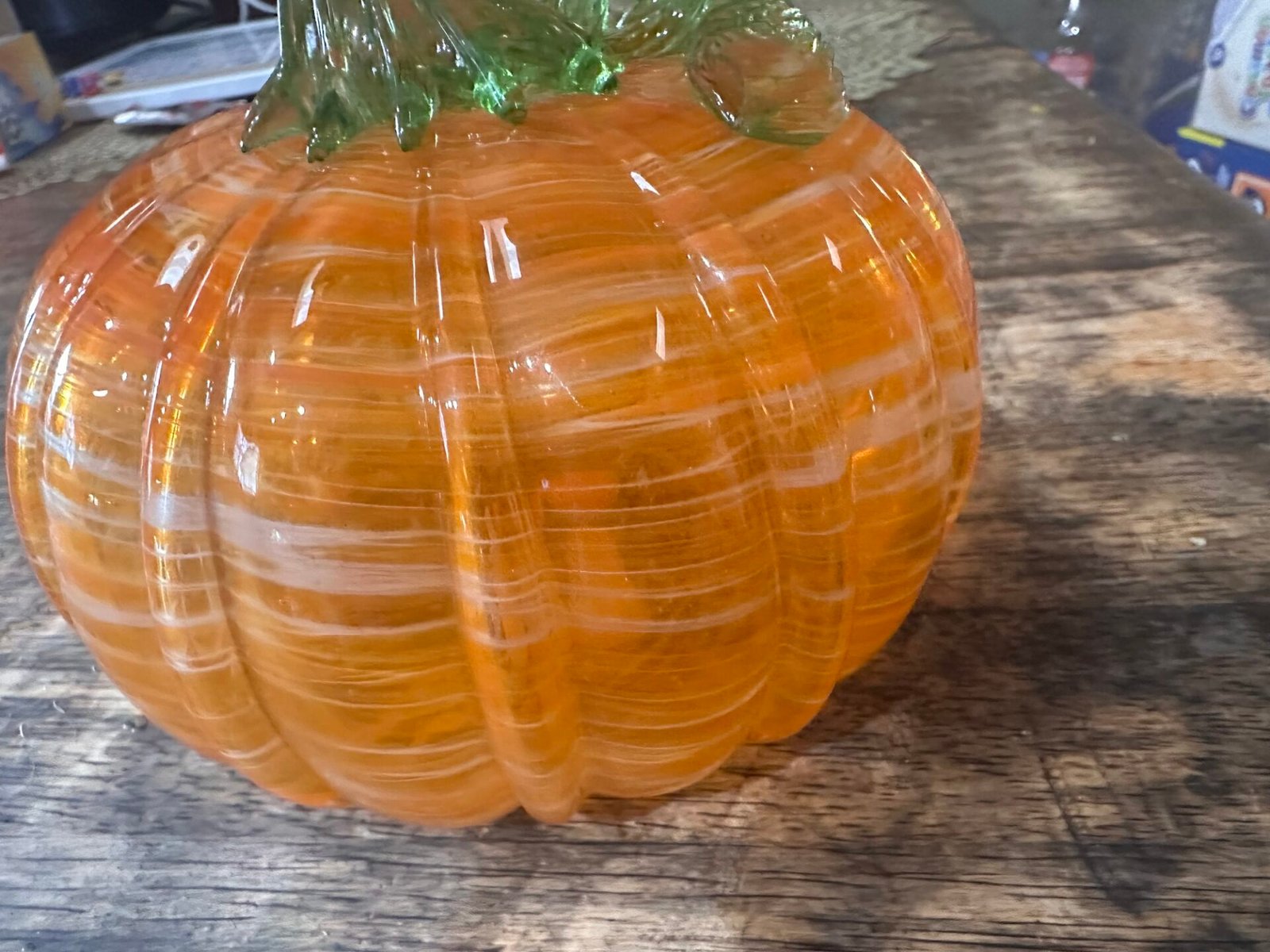 Hand Blown Art Glass Pumpkin Orange with Green Stem Fall Decor Harvest