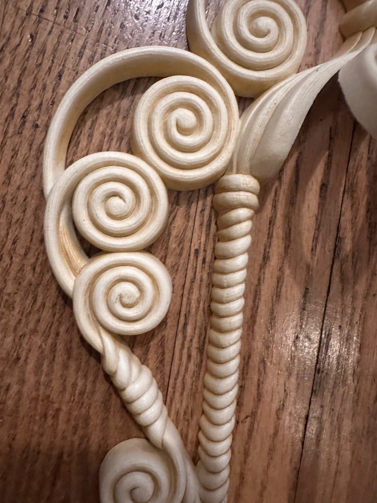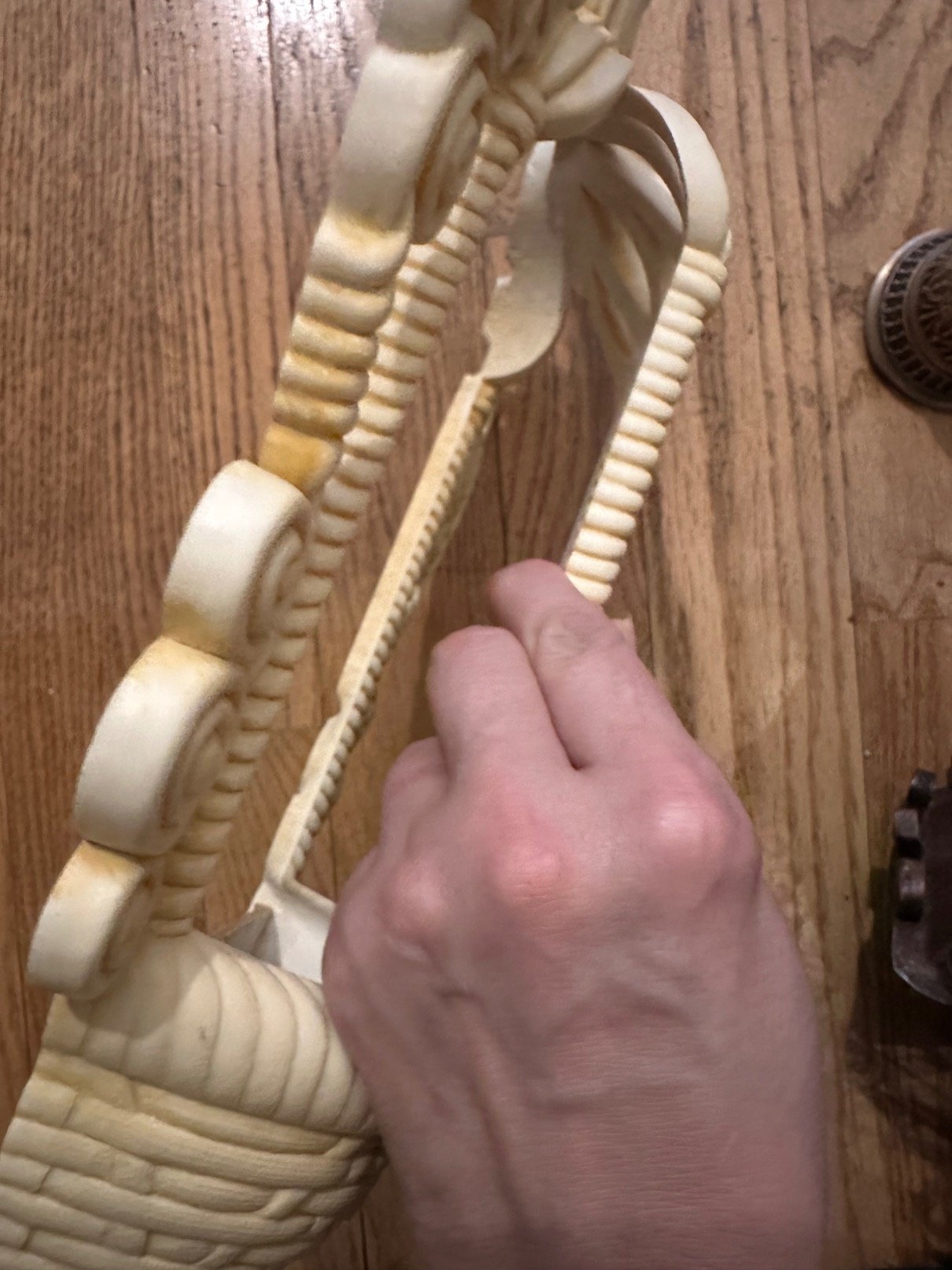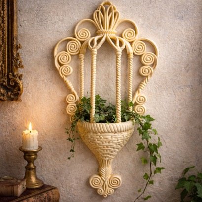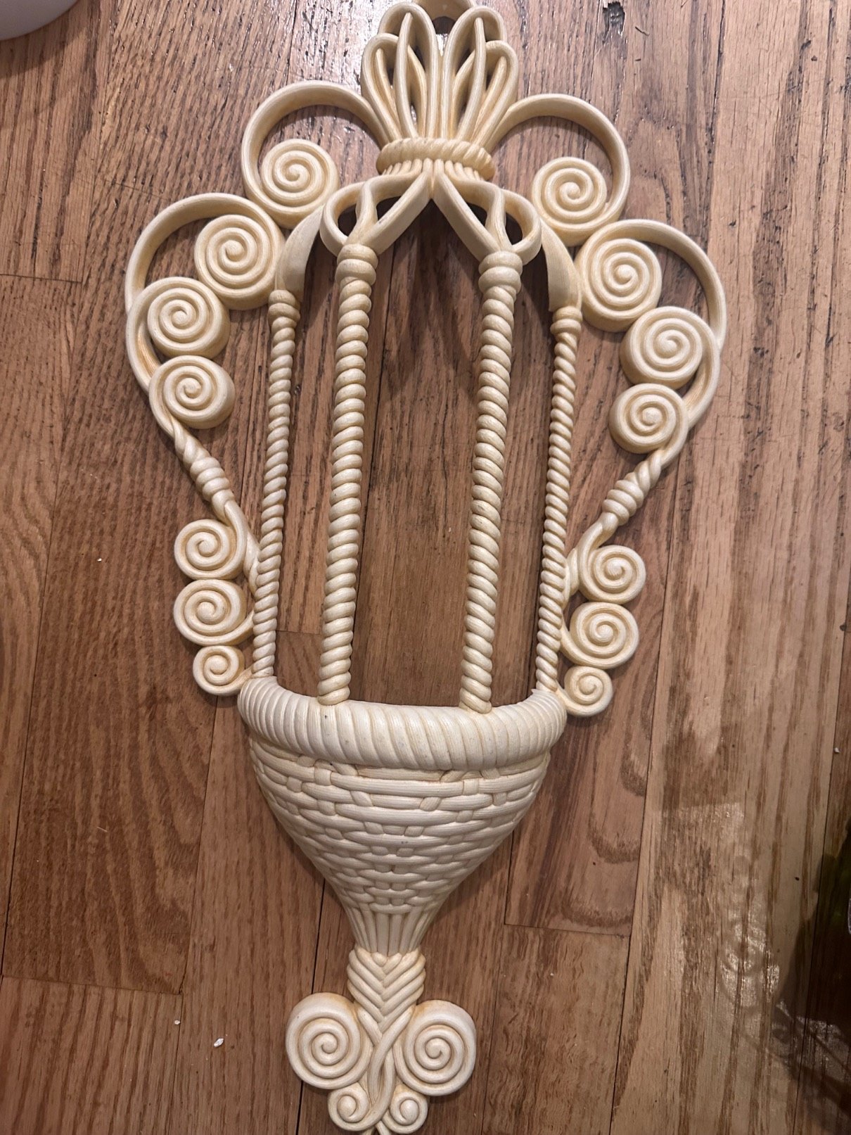 Add sculptural texture to your walls with this vintage mid‑century modern molded plastic wall plaque featuring ornate scrollwork and basket styling.