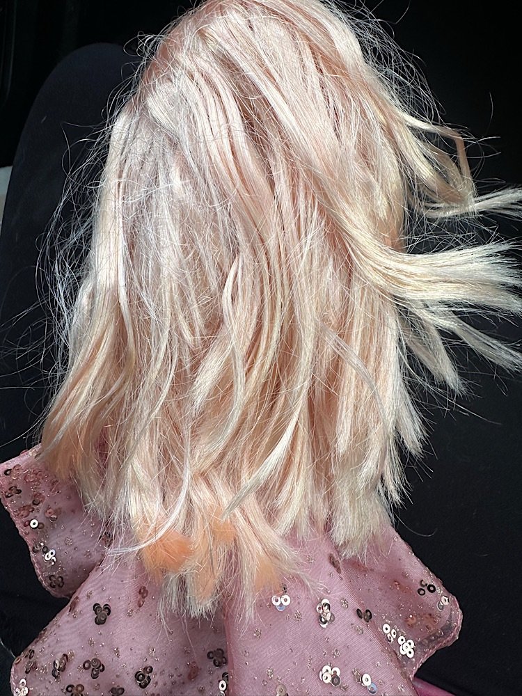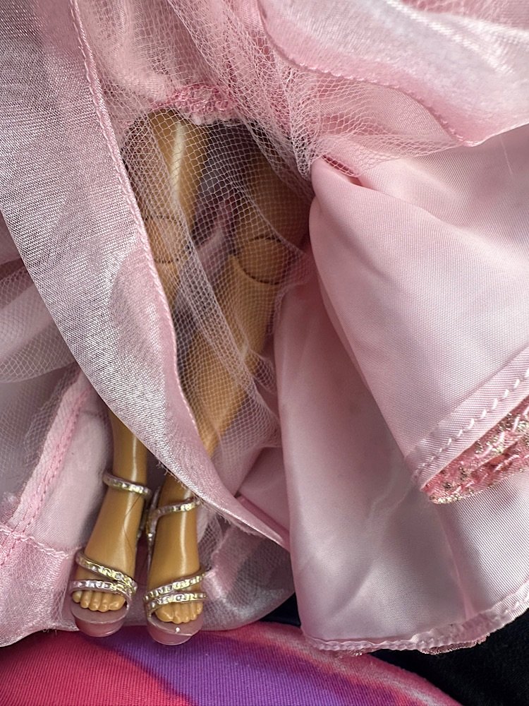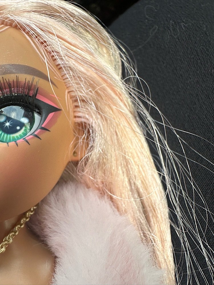 Hair shows minor flyaways from handling. Outfit intact and displays beautifully.There is something missing from the top of her dress. See pictures.