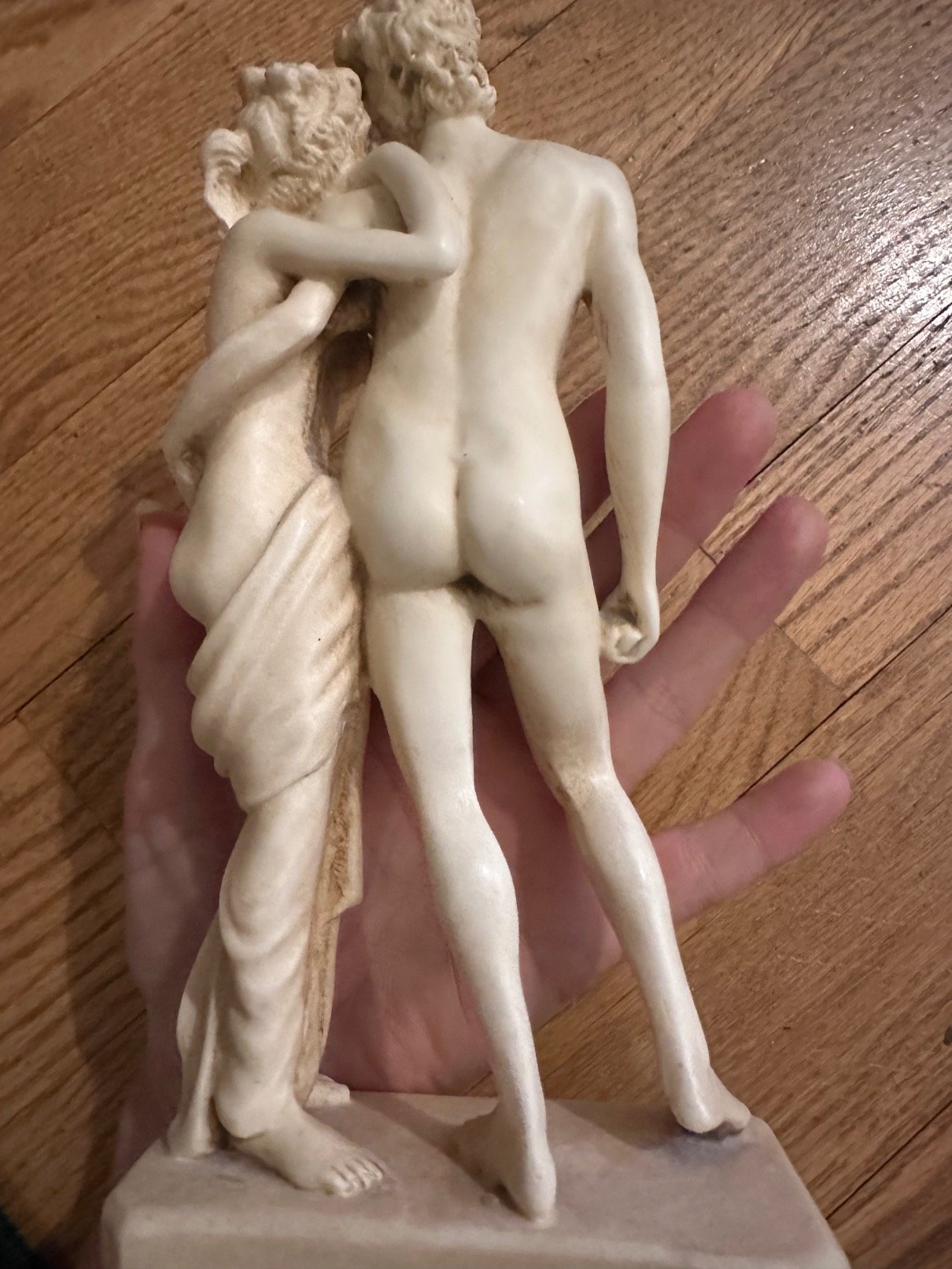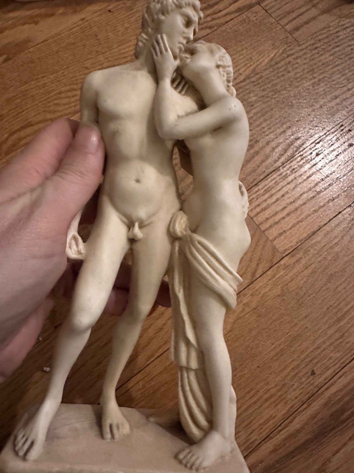 Vintage resin sculpture depicting Venus and Adonis in an intimate classical pose. Romantic mythology decor with Greco‑Roman inspiration, detailed carving, soft aged patina.
